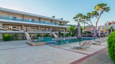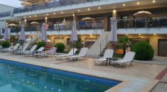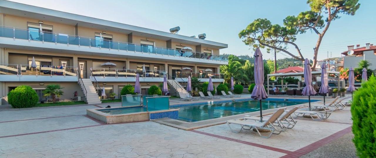 Hotel apartmanskog tipa Sarti Inn se nalazi u centralnom delu Sartija, na oko 120 metara udaljenosti od plaže. Kompleks čine 2 objekta između kojih se nalazi lepo uređeni prostor sa bazenom, suncobranima i ležaljkama koje gosti mogu besplatno koristiti. U ponudi su dvokrevetni i trokrevetni studiji smešteni na prvom i drugom spratu kao i četvorokrevetni studiji koji se nalaze u spuštenom prizemlju. Svaka smeštajna jedinica poseduje osnovno opremljenu kuhinju, kupatilo, komfornu terasu koja gleda ka bazenu, TV i klima uređaj čije je korišćenje uključeno u cenu najma apartmana. Promena posteljine, peškira i čišćenje je na 3 dana. Objekat poseduje i tuš kao i toalet za poslednji dan boravka a postoji i mogućnost korišćenja WiFi interneta.